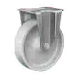 Roulettes roue en nylon blanc (Voir roues série P), pour charges moyennes, monture en tôle inox 304 L emboutie, pivot central boulonné à la platine, pivotement sur double rangée de billes inox 420 L, protégé par un cache poussière circulaire en plastique.