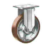 Roulettes bandage polyuréthane dureté shore 95, moulé sur corps fonte nervuré (Voir roues série Z), pour très fortes charges, monture en tôle d'acier estampée de très forte épaisseur, pivot central soudé sur la platine, pivotement sur une rangée de billes traitées plus un roulement à rouleaux conique.