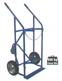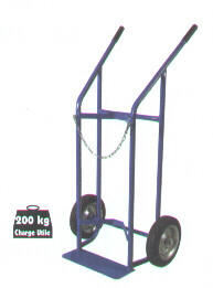 Modèle bi-bouteilles Poids : 29 Kg Dimensions : 1280 x 760 mm Roues bandage caoutchouc : Ø 280 x 70 mm Pelle à bouteilles Dimensions de la pelle : 575 x 100 mm Charge utile de 200 Kg Spécialement conçu pour la manutention manuelle de bouteilles. Diable référence N° - 18.04